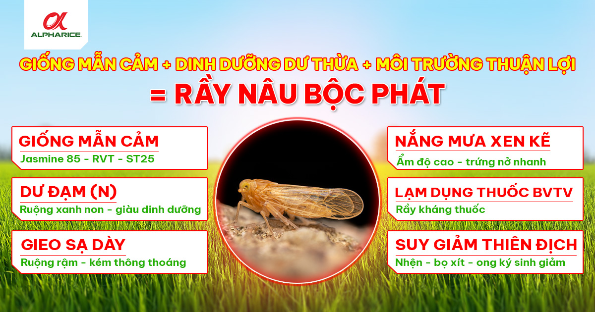 Chính sự kết hợp giữa giống mẫn cảm – dinh dưỡng mất cân đối – môi trường thuận lợi là nguyên nhân khiến rầy nâu dễ bộc phát mạnh trên các giống lúa chất lượng cao.