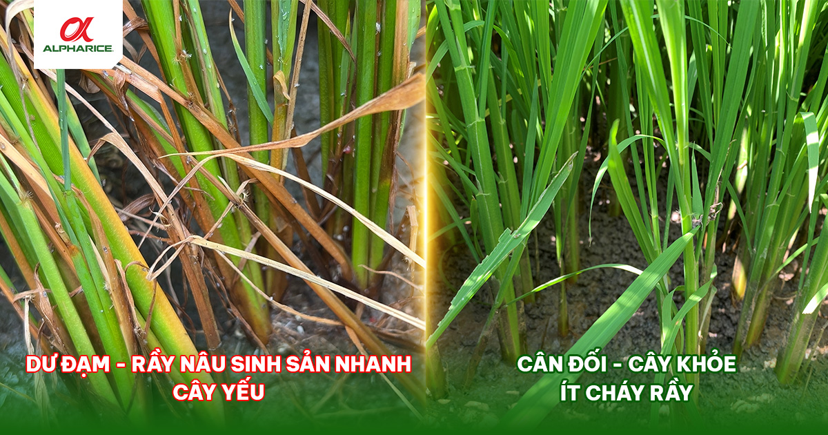 Bón thừa đạm (N): Ruộng lúa xanh đậm, lá non phát triển mạnh, giàu dưỡng chất, kích thích rầy nâu sinh sản nhanh.