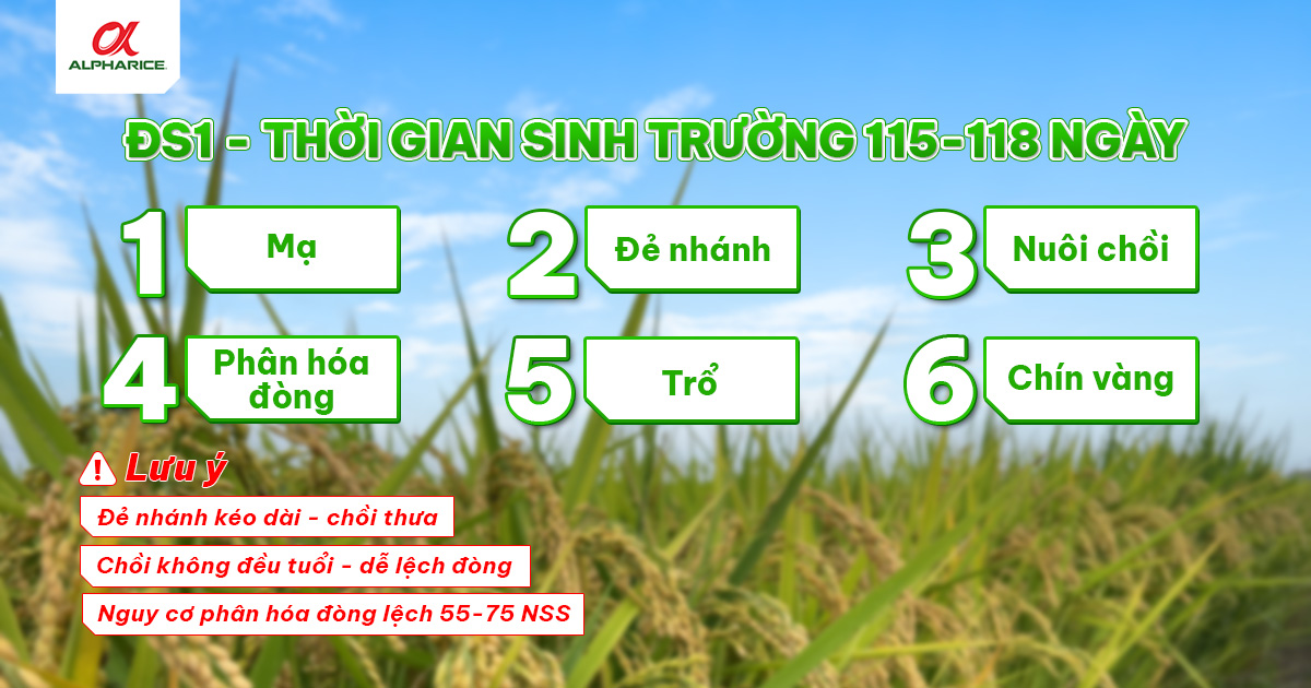 ĐS1 có thời gian sinh trưởng trên 115 ngày, dài hơn phần lớn giống Indica phổ biến. Đặc điểm này gây ra các vấn đề: